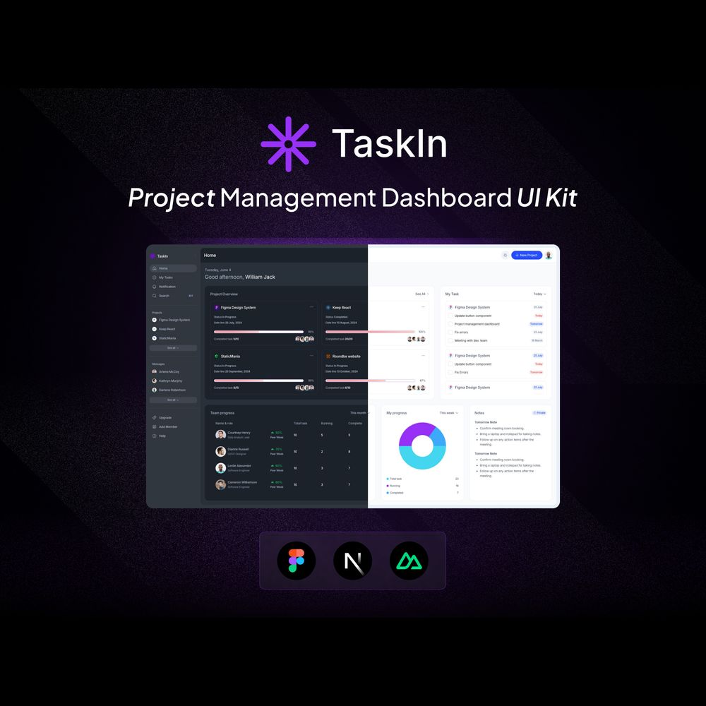TaskIn is a versatile task management dashboard designed for Figma, NextJS(React) and NuxtJS(Vue) featuring 45+ screens for web and desktop applications. Whether you're building a collaborative team platform or a personal productivity tool, TaskIn provides an extensive set of fully customizable components to bring your ideas to life.With its responsive designs, TaskIn ensures a seamless user experience across all devices, catering to the demands of modern users. The dashboard is powered by NextJS and NuxtJS, offering high performance and scalability, while the Figma UI kit utilizes auto-layout for effortless customization and adaptability to your brand. Streamline your design and development process with TaskIn, the perfect foundation for creating exceptional task management applications. Features: Fully CustomizableAuto LayoutLight and Dark ModeNext JS 14 App RouterNuxt 3Crafted with Tailwind CSSTypeScript SupportMade with Keep Design System Checkout Live Preview on this link: https://taskin-dashboard.vercel.app/